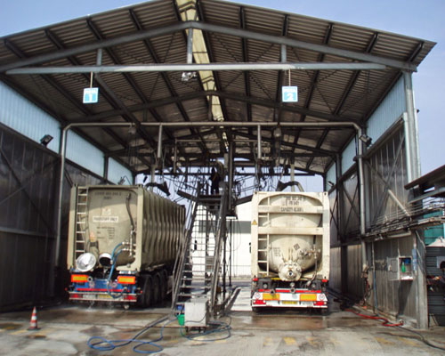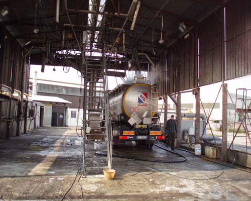 L'impianto lavaggio è costituito da due piste, separate dalle piste alimentari sia come struttura che impianti secondo la normativa di legge. Ogni pista è servita da N° 5 testine rotanti con portata di 60 litri d'acqua al minuto cadauna, 3 erogatori di vapore e 1 asciugatore, inoltre abbiamo testine rotanti atex per la bonifica di prodotti infiammabili. L'acqua di lavaggio è addolcita a zero gradi francesi.